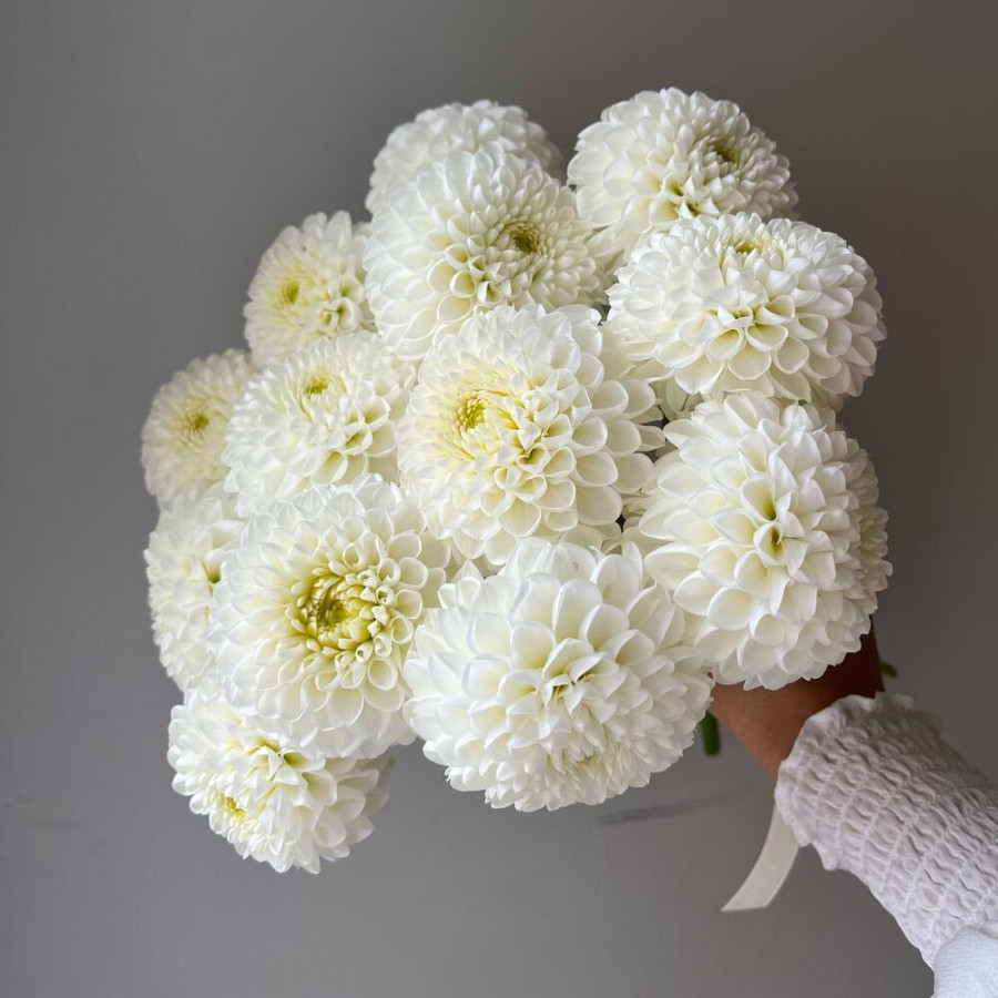 На фото букет из 13 белых георгин. В составе: георгина 13 шт, дизайнерская упаковка 1 шт, атласная лента 1 шт, . Все цветы свежие и ароматные, букет красиво оформлен и отлично подходит для подарка. Доступна доставка цветов или самовывоз.
