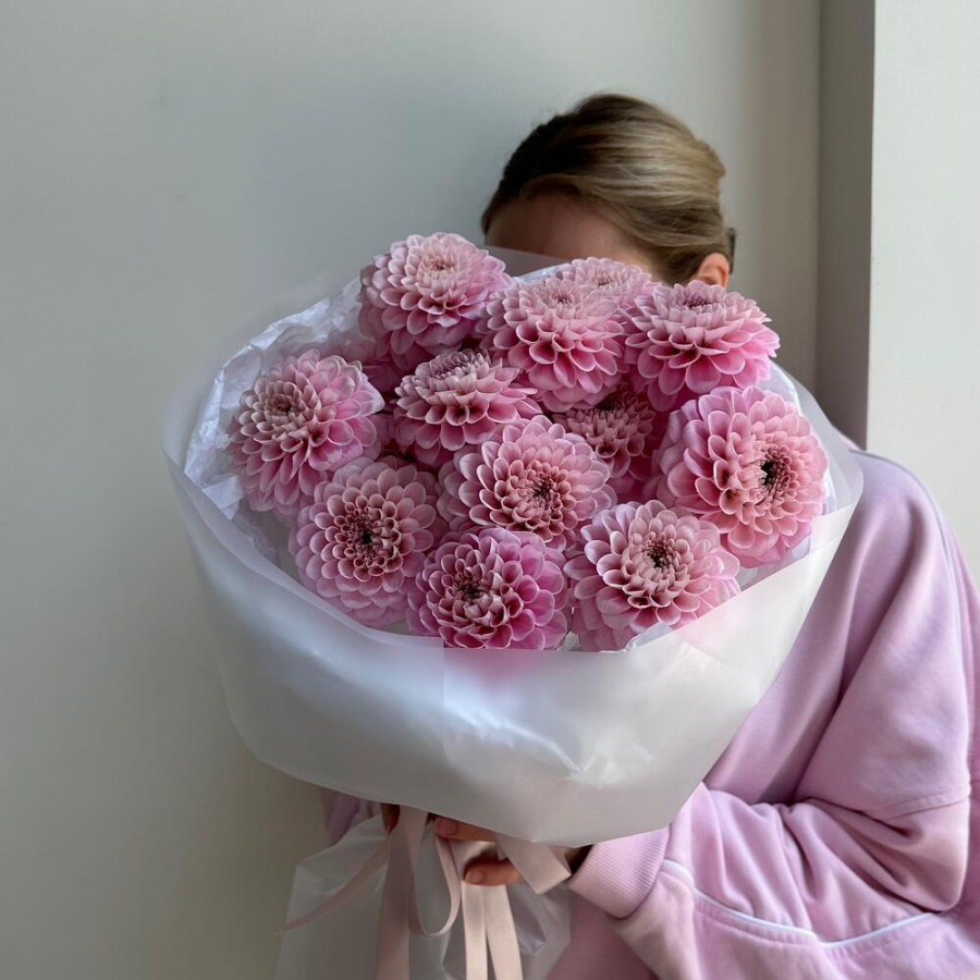 На фото букет из 15 розовых георгин. В составе: георгина 15 шт, дизайнерская упаковка 2 шт, атласная лента 1 шт, . Все цветы свежие и ароматные, букет красиво оформлен и отлично подходит для подарка. Доступна доставка цветов или самовывоз.