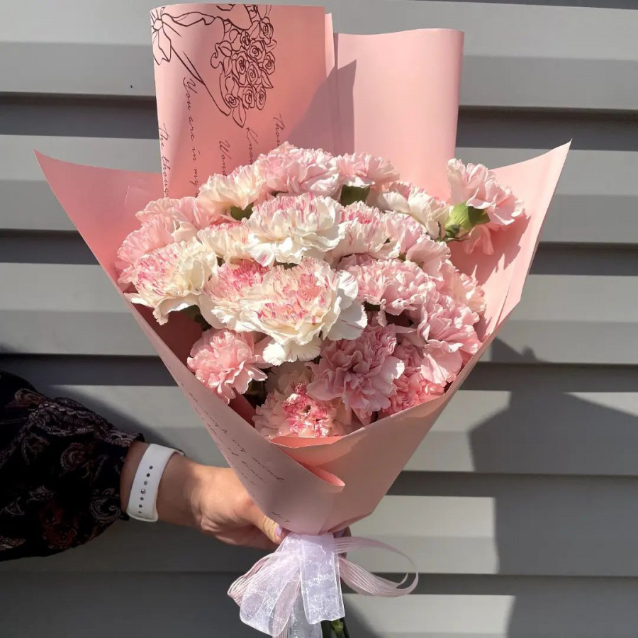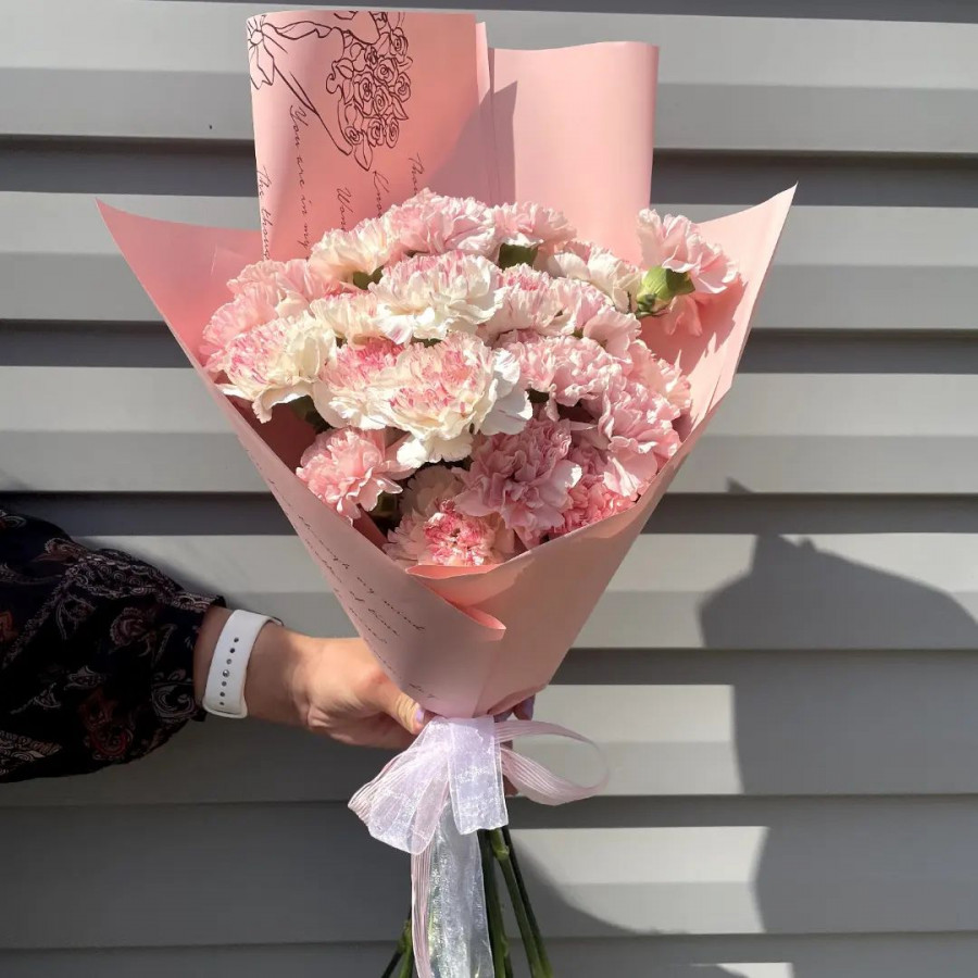 На фото букет из 9 кустовых гвоздик. В составе: гвоздика кустовая 9 шт, крафт-бумага 1 шт, атласная лента 1 шт, . Все цветы свежие и ароматные, букет красиво оформлен и отлично подходит для подарка. Доступна доставка цветов или самовывоз.