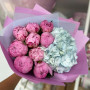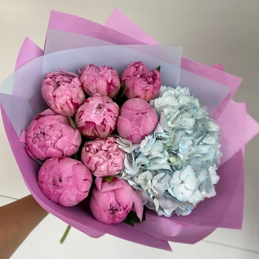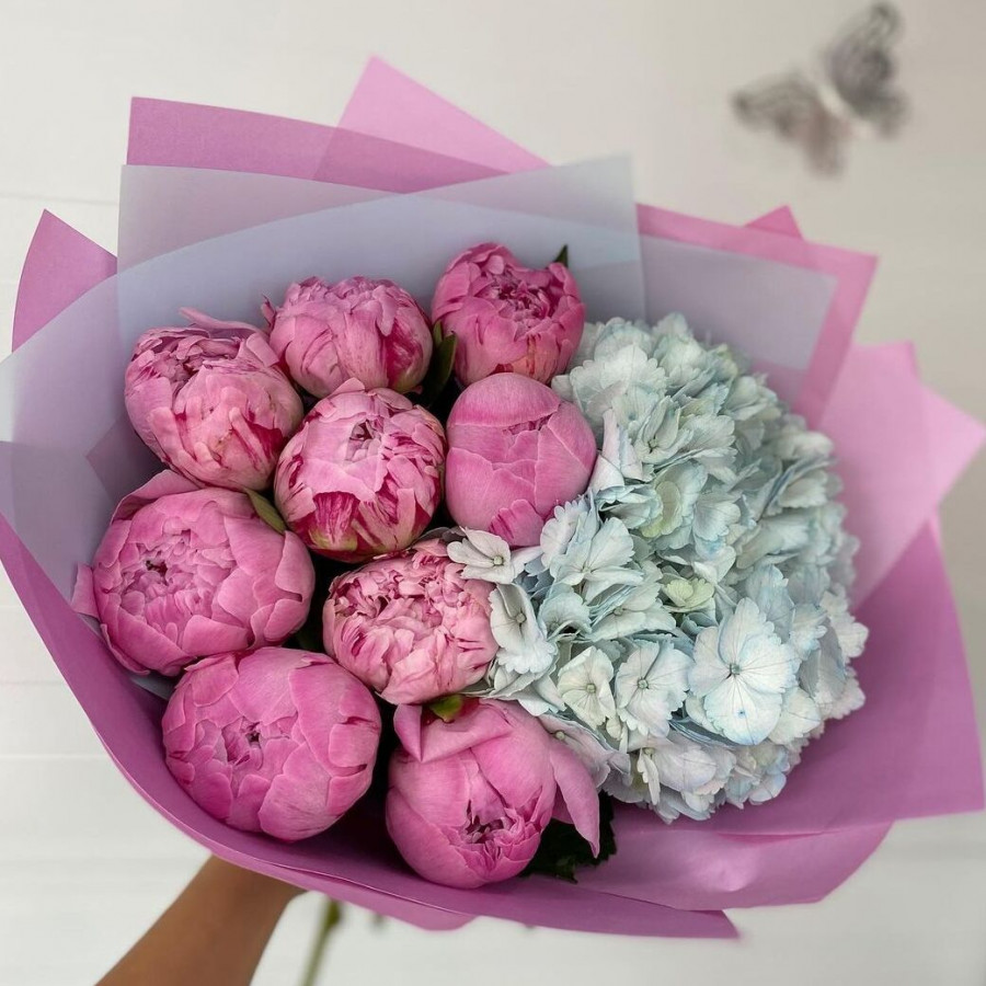 Букет из розовых пионов и голубой гортензии в Балашихе